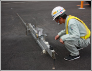 舗装路面の摩耗、アスファルト混合物の流動などによって発生するわだち掘れ量を測定することを目的とした試験です。