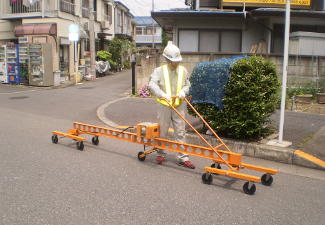車両通過頻度の最も多い位置で、3mプロフィルメータを時速3~4㎞でけん引して、1.5m毎にグラフの値を記録し、標準偏差を算出する。